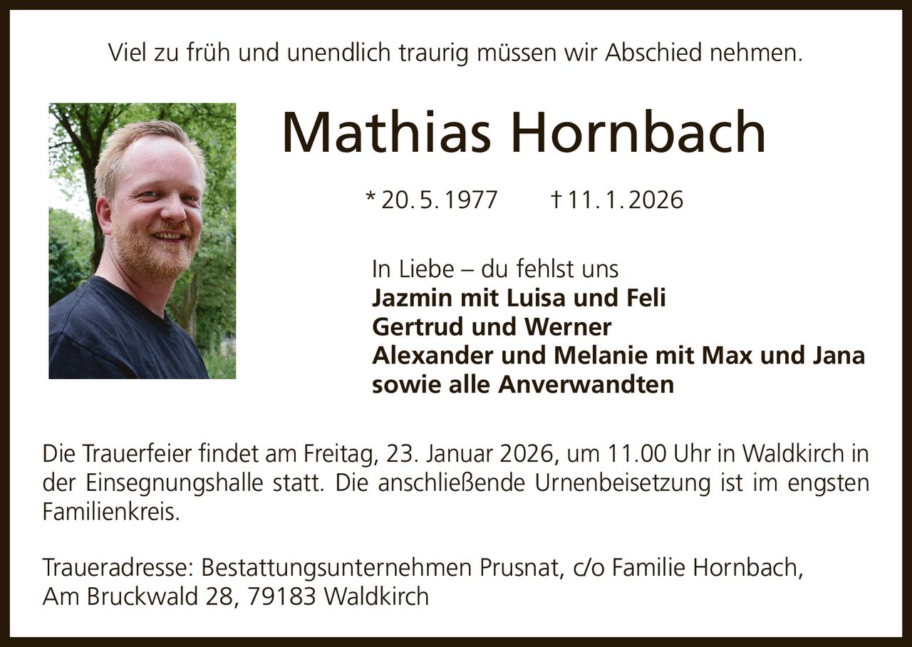 Mein aufrichtiges Beileid! Ich durfte Mathias letztes Jahr bei der "Rauszeit" auf dem Feldberg kennen lernen und werde ihn so aktiv, sympathisch und lustig in Erinnerung behalten. Viel Kraft der Familie und allen, die ihm nahe stehen.