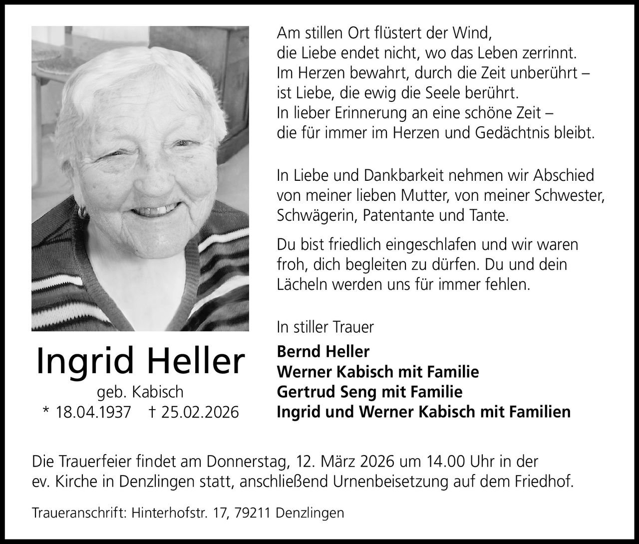 Die große Verbundenheit, die wir auf so vielfältige Weise erfahren durften, hat uns sehr geholfen. Wir bedanken uns auch für die zahlreichen Blumen- und Geldspenden. Letztere haben wir an die Tagespflege Glockenblume weitergegeben. Denzlingen, im April 2026